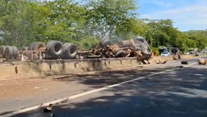 Carreta carregada de adubo tomba e interdita parcialmente a rodovia; motorista sai ileso do susto. Um acidente de grandes proporções movimentou a BR-050...