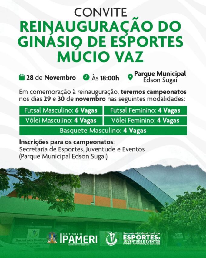A Prefeitura Municipal convida a população para a solenidade de reinauguração do Ginásio de Esportes Múcio Vaz. O evento acontece no dia 28...
